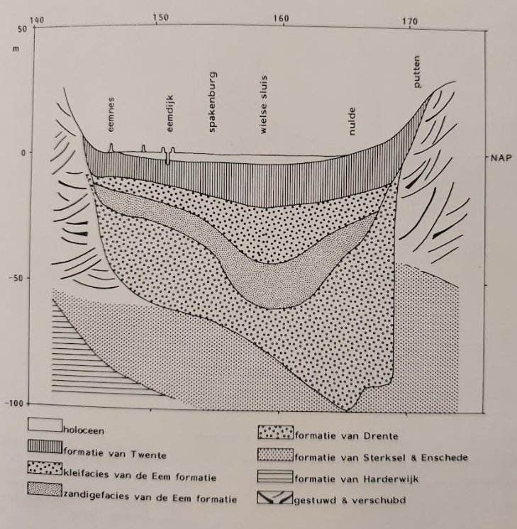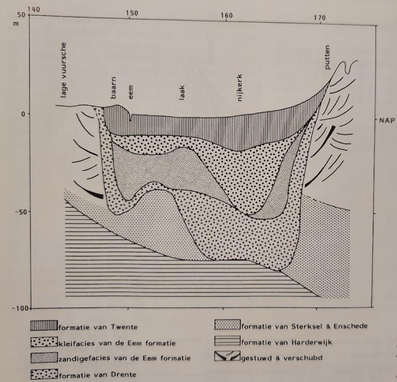 Bovenop de door de rivieren afgezette zanden bevindt zich weer een laag die door de zee is afgezet. Dit is dan ontstaan doorat in de volgende periode de zeespiegel steeg waardoor de zee weer binnendrong in ons gebied, en weer zand- en kleilagen afzetten. Deze laag, de Eemafzetting genoemd, loopt vanuit het zuiden af, totdat deze bij Nijkerk tussen de 20 en 50m diepte: in het midden van de Vallei op 50m, aan de ronden tot 20m diep. De eemklei belemmert de verticale beweging van grondwater. De watervoerende delen van de formatie van Drente en de Eemformatie vormen samen een watervoerende laag, het zogenaamde middeldiep grondwaterwater voerende pakket.